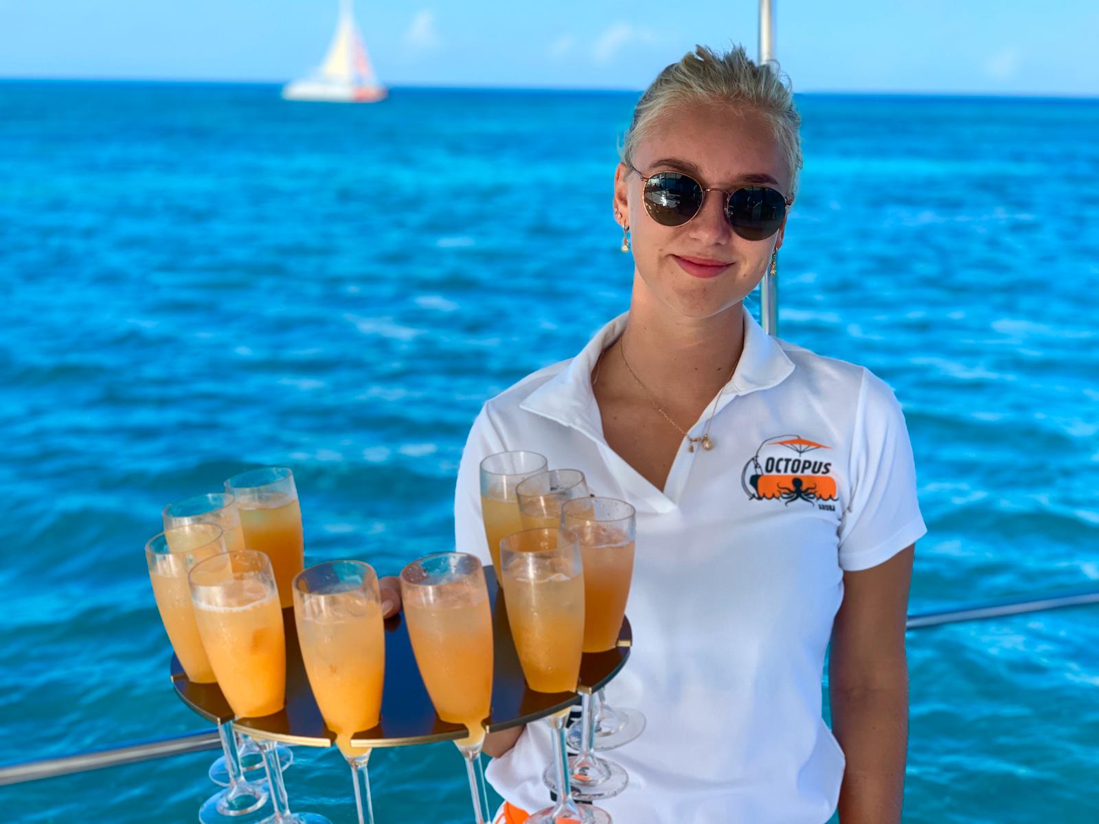 Start your morning in style aboard our luxurious VIP catamaran, gliding across Aruba’s crystal-clear waters. Sip a chilled mimosa or fresh juice as we welcome you to an unforgettable day at sea. Our first stop: the world-famous